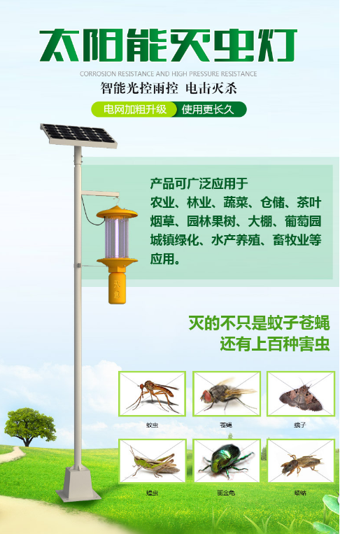 新鄉天意新能源研制的太陽能殺蟲燈是利用太陽能轉換為電能的原理,根據害蟲的趨光性設計特制的誘蟲光源,針對不同農林作物進行大范圍、寬領域物理滅蟲的植保器械。公司與中國農科院植保所和中國科學院半導體所、河南省農科院植保所共同研發殺蟲燈,注重的是殺蟲燈根本作用-殺蟲效果,所以天意公司的殺蟲燈深受廣大客戶的信賴。